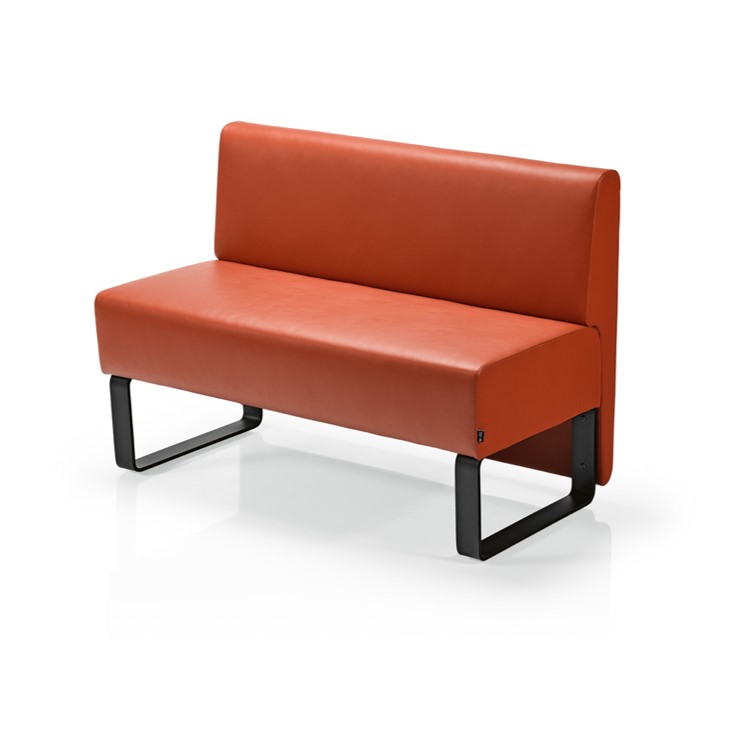 Sofá hotelaria profissional com estrutura metálica, disponível com estofo em várias categorias e cores de semi-pele e tecidos.